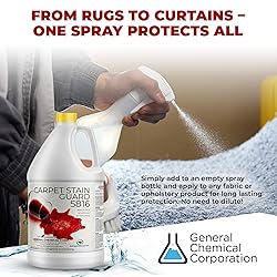 READY-TO-USE STAIN PROTECTOR FOR CARPET, UPHOLSTERY, & MORE: Introducing Carpet Stain Guard 5816 - our ultimate ready-to-use fabric and upholstery protector . No need for dilution – it's all set to go! This indoor and outdoor fabric protector spray has superior shielding power, providing an invisible barrier against the most stubborn stains caused by foot traffic, soil, food, drinks, & other common household mishaps, keeping your carpets, rugs, upholstery, and drapes looking fresh and new. EASY-TO-USE FABRIC STAIN GUARD : Applying Carpet Stain Guard 5816 is a straightforward process that can be done by anyone. Simply pour our rug & carpet protector spray into any spray bottle and apply it to the desired area. Each gallon of our powerful upholstery protector spray formula safeguards approximately 200 square feet of fabric, defending against juice, wine, ice cream, soda, and other dreaded stains, which then quickly dries, leaving behind an invisible shield for instant protection. LONG-LASTING WATER AND STAIN PROTECTOR: Our advanced fabric stain protector for upholstery effectively blocks both oil and water-based stains from embedding into your carpets, rugs, and upholstery. With this protective barrier, your fabrics will maintain their pristine condition between cleanings and stand the test of time. By acting as a shield against spills and grime, it prevents permanent damage and extends the lifespan of your beloved carpets and furniture. PRESERVES AND ENHANCES - KEEP FABRIC LIKE NEW: Enhance the existing stain-resistant treatments on your fabrics or create a new safeguarding layer with our protector spray heavy duty water repellent and stain repellent. Whether it's wool, upholstery, drapery, or any water-safe fabric, our outdoor protector spray and stain guard has got you covered to keep your home looking fresh and immaculate. GENERAL CHEMICAL - MADE IN USA: We've produced professional specialty chemicals for over 40 years. We've listened to what real workers need from their products and developed formulas made for you. We're based right here in the USA and are proud to serve customers all across America. We remains committed to providing premium-quality chemical solutions that empower professionals to achieve their best results.