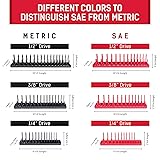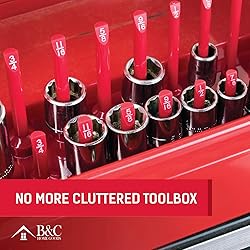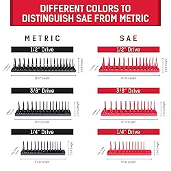 Clutter Cleansing: This socket organizer will revolutionize your toolbox. With its heavy duty, 6 set socket trays (in both SAE & metric measurements) it's the perfect aid to keep your workbench & garage in order. No more rummaging for rogue sockets! Organize By Size: We want to make your life as easy as possible - particularly when you’re mid-repair & don't want to be searching through a messy tool chest! This socket organizer tray has clearly labeled measurements for convenient size classification. SAE & Metric Trays: Our socket organizers for toolboxes feature a color coordinated system to help you identify which measurement tray you need - 3 red SAE trays & 3 black metric trays - so you can quickly & easily recognize the correct socket holders. Stability: We pride ourselves on creating practical & effective products. Which is why our socket tray have been developed w/ an extra-large base, offering increased stability to avoid unnecessary tipping. Reliable products you can trust. Size: Does your disorderly toolbox affect your work? If so, our socket storage organizer can save the day! The 1/4" drive trays fit sizes 1/8"-5/8” & 4-15mm, the 3/8" trays 1/4"-1” & 6-20mm & the 1/2" trays 3/8""-1 1/4" & 10-27mm. Get your sockets sorted!