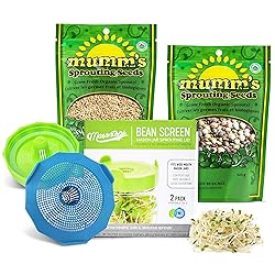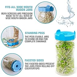 TRANSFORM A WIDE MOUTH MASON JAR INTO A HOME SPROUTING JAR: Our sprout kit has all the supplies for germination of all types of sprouts, from alfalfa to broccoli and lentil. With our sprouter kit you'll receive 2 Bean Screen lids and two sprout packs. 2 INNOVATIVE FEATURES: Bean Screens have standing pegs, to promote full drainage, preventing spoilage. The faceted sides stop jars from rolling, providing the sprout maker a stable growth environment and stops them from rolling off counters. BEAN SCREENS & OPTIMAL AIRFLOW: The screen and inverted spout maximize airflow, preventing spoilage. Growing nutritious sprouts is fun and easy with this Bean Sprout Machine. Alfalfa sprouts are packed with phytonutrients and are high in protein too! 2 PACK OF ORGANIC & GMO-FREE SEEDS: Includes Mumm's seeds grown in Canada. Mumm's has been selling seeds for over 30 years. Enjoy your bean sprout grow kit with both the Sandwich Booster (trifolium repens, medicago sativus), and Crunchy Bean (lens culinaris, cicer arietinum) mixes. MADE OF DISHWASHER AND FOOD SAFE PLASTIC: Bean Screens are built to last and are easy to care for. They cleanup in the dishwasher and are made from durable, BPA-free plastic. So you can be sure they'll last and be 100% safe for you and your family.