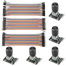 The rotation counts are not limited, designed with continuous 360 degree rotation sensors.(cap included) Working voltage: 5V; Reset to its initial state with the buttons on the rotary encoder, starts counting from 0. Designed with detent and push button switch feature, comes with nuts and washers, suitable for Arduino micro controller use. Jumper wires kit, compaitible with 2.54mm spacing pin headers, great for Arduino PCB project, pc motherboard. Package Content: 5 * KY-040 Rotary Encoder Module + 120 PCS Ribbon Cables Kit(including male to male, male to female, female to female).