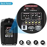 360 WATT POWER: This Pyle 2 way active PA speaker system and mic set include a handheld microphone and a 360W portable PA speaker w/ 8" Subwoofer for a full range stereo sound reproduction and impressive bass response COMPATIBLE WITH BLUETOOTH: This box type PA amplifier loud speaker is compatible with bluetooth for wireless audio streaming and works with devices like iPhone, android mobile phone, iPad, tablet, PC. Ideal for personal indoor home and outdoor use 5 INPUTS: Equipped w/ a USB port for DJ mixing / audio blending, SD card slot for MP3 playback, RCA (L/R) stereo line input jacks, and 2 ¼” microphone inputs w/ an included wired handheld mic. It also has an FM radio with digital LCD display ENGINEERED ABS HOUSING: This portable stage and studio tested active powered loudspeaker features a heavy duty engineered ABS housing in a rugged and durable cabinet design for a reliable sound. It also has a handle and wheels for easy travel RECHARGEABLE BATTERY: This compact and powerful battery powered heavy duty wireless PA system has a 12.1V lead acid 3000mAh rechargeable battery which makes it convenient and portable. Also features a rear panel button control center and remote