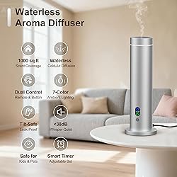 - This high-end waterless diffuser uses advanced cold-air diffusion technology to transform pure essential oils into an ultra-fine mist—no water, no heat, and no residue. Crafted from durable aluminum alloy, this scent diffuser diffuser blends minimalist design with whole-room coverage of up to 1,000 sq. ft., making it ideal for large spaces such as living rooms, offices, and spa areas. Operating at under 38 dB, it functions as a whisper-quiet aromatherapy diffuser, paired with a 7-color ambient light to create a calming environment. With adjustable mist levels, smart timer options, remote control, and memory function, this scent diffuser for home offers a fully customizable scent experience. Built-in tilt protection ensures safe use around children and pets, making it one of the most reliable home fragrance diffuser choices for modern, wellness-driven lifestyles.