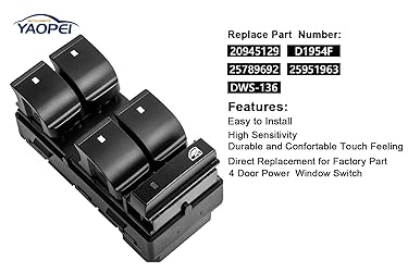 - Perfect Compatibility: Fits 2007-2013 Chevy Silverado 1500, 2007-2014 Silverado 2500HD/3500HD, 2007-2013 GMC Sierra 1500, 2007-2014 Sierra 2500HD/3500HD, 2009-2014 Buick Enclave. - Direct Replacement: Exact fit for OEM part numbers 20945129, 25789692, 25951963, D1954F, DWS-136; please verify original part and OEM number before ordering. - Reliable Quality & Service: YAOPEI products pass strict quality inspection. Contact us via Amazon Messages anytime for quality issues or technical support. - Easy Installation: No professional tools needed; simply remove old switch and install this replacement. Tutorial videos available online for guidance if needed. - Specifications: 1. Location: Front Left Driver Side; 2. Material: Plastic; 3. Color: Black; 4. Terminal Quantity: 8+6 Pins; 5. Switch Type: Master; 6. Illuminated: Blue Light;
