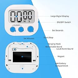 FUNCTION:99 minutes 59 seconds counting up/down digital magnetic kitchen timer with setting memory.Push and hold button over 3 seconds then the time will fast forward. LOUD ALARM: Features loud and clear but not deafening sound to be heard from another room,it continues 60 seconds if you don't press it. PLACEMENT: You can pull back the retractable stand to sit on any flat surface or use the magnet on the back to attach to a fridge door or Put it on the neck(use a rope). POWER SAVING MODE:Save the battery with ON/OFF Switch.(battery is not included). LARGE READOUT: Large Screen 2.2 x 1.18 inches. bold digits for easy readability from anywhere in the kitchen.