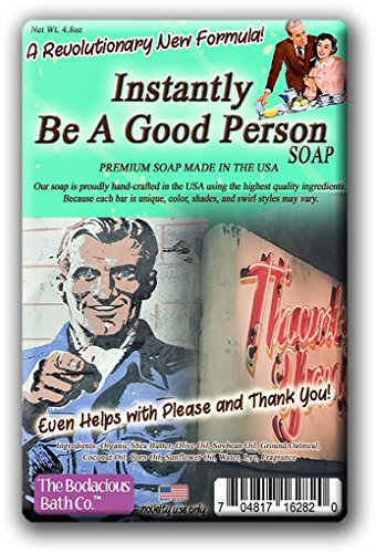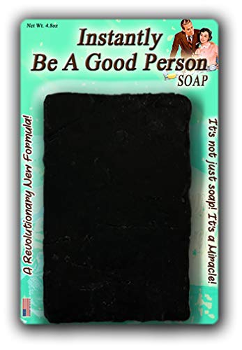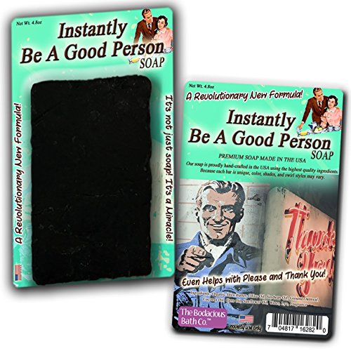 Instantly Be A Good Person SoapBeing rotten to the core got you down? Tired of dogs howling, babies crying, and children screaming in your general presence? Now, you can turn that evil into innocence with a simple shower, thanks to Instantly Be A Good Person Soap!Instantly Be A Good Person Soap will have that black heart pumping true blue in no time. Its pine tar scent will magically wash away any horrible habits and restore your soul to a sparkling shade of human decency in a flash.For best results, use daily. Probably multiple times.Hilarious Gag Gift for Friends Who Could Use a MiracleBefore Instantly Be A Good Person Soap, there was no miracle cure for guys and gals who could use a boost in the human decency department. This weird bath gift for friends, family, and coworkers is a gut-busting surprise addition to gift baskets, care packages, and birthday gifts. Slip a bar of this awesome friend gift in as a fun stocking stuffer or wrap it up as a crazy Secret Santa or White Elephant present.Bodacious Bath Soaps are handcrafted in the US with high-quality ingredients. Because every luxurious bar of premium bath soap is unique, colors and patterns may vary from display images.