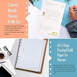 🦜 Colorful Pattern Design 🌿 A5 6-Holes Undated Binder Refill 🌟 Independent Record Area for Everyday ✅ 2 Pack 90 Sheets(180 Pages) Weekly Planner Refills 🍂 W/ Neon Page Marker, Binder Pocket, Binder Dividers 🌤️ Bright Appearance ~ Weekly planner loose-leaf to carry with you, there are beautiful little girls beckoning to you, birds singing, cute rabbits smiling at you on the paper. Take them with you, study and live with the little girl, and record your daily life ✨ Reasonable Week Page Design ~ Weekly Planner refills contain a one-week general plan and a sub-plan for seven days a week. When starting a new week, write down your plans and good hopes for this week in the weekly plan column at the top. And in the following days, you will earnestly complete the daily plans on the paper 📒 Plan for The Week ~ Before the beginning of the next week, we have not established goals for study and work. For up to 7 days, we will feel confused and work inefficiently. So we need a planner to stay focused, track our goals, and help us improve performance and overall quality of life.Then this focused planner is the perfect solution for you ✔️ Material and Quantity ~ 100 GSM thick paper to ensure that your pen will not leak.The surface is smooth, very suitable for writing, painting, etc. A5 refills weekly planner inserts are suitable for loose-leaf notebooks, diaries, planning notebooks, etc. They can be easily inserted into all standard A5 size 6-ring binders 🌈 Value Weekly Planner Package ~ Each set contains 2 packs 6-ring A5 Weekly planner note pads, 5 Flags Index Tabs, 5 index pages and a transparent binder pocket. 2 monthly refills contain 90 sheets undated insert paper. Paper Size: (21x14.2cm), fit for A5 binder