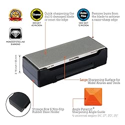 FAST, Durable and Heavy-Duty: Industrial monocrystalline diamonds are electroplated onto a stainless steel base of 0.35 inch thickness. Up to 5 times faster sharpening than oil stone, water stone DUAL GRIT: Coarse 325 grit (45 micron) for quick edge setting; Extra fine 1200 grit (12 micron) for honing. Sharpen and Hone HARD Material including High Speed Steel, Carbide, Ceramic & Cubic Boron Nitride. Sharpen dry. No messy oil or water needed. Super FLAT Surface: SHARPAL exclusive MirrorFlat technology guarantees long-lasting even contact with knives or tools, while oil stone and water stone easily wear down with uneven surface Superior Bonus Pack: Includes storage box with non-slip rubber pad that can be used as a stone base while sharpening; With Sharpening Angle Guide integrated with 4 universal angles-14°, 17°, 20°, 25° and instruction manual inside of packaging 3 YEARS of Commitment and Superior After-Sale Service: SHARPAL, headquartered in California, USA, with branches in Germany and Australia, provides easy and effective sharpening solutions. All products undergo rigorous testing to ensure top-tier performance and durability.