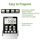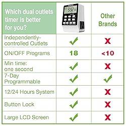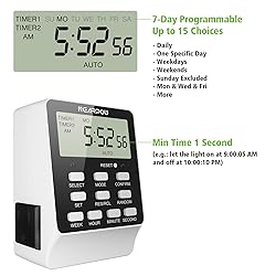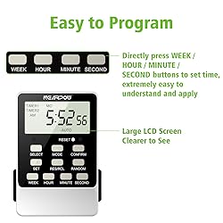 2 Independently-controlled Outlets: This 3-prong timer outlet can control different appliances independently at the same time. Dual grounded outlets make it equal to 2 single-outlet timers Up to 18 ON/OFF Programs: The outlet timer offers up to 18 individual schedules to turn on/off electronics automatically. The 7-Day programmable timer switch also provides up to 15 choices for week setting Easy to Program: This digital light timer allows extremely convenient and flexible time setting for week, hour, minute and second directly, super easy to understand and apply, fully meet your needs. And the Min setting time is as precise as 1 second Multifunctional: 12/24 Hours System to show AM/PM conveniently. Daylight Saving Time just one step. Random Vacation Mode to make your home look “lived in” even when you’re away, thus protecting your home from thieves. Child Lock Function to protect saved programs Widely Used: NEARPOW 3-prong grounded timer outlet, easily program, ideal for all kinds of electric pumps, lights, cooling and heating systems, indroor sprinklers, humidifiers, aquariums, nebulizers, ventilators and more