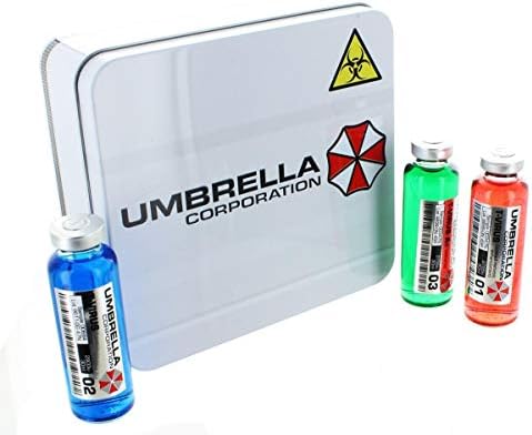 Officially licensed replica set. Set includes 1 tin case and 3 glass vials. Vials include 1) T-Virus 2) T-Virus nemesis enchantment, and 3) T-Virus A+ - Antivirus. Vials are 3" tall and 1.5" wide.