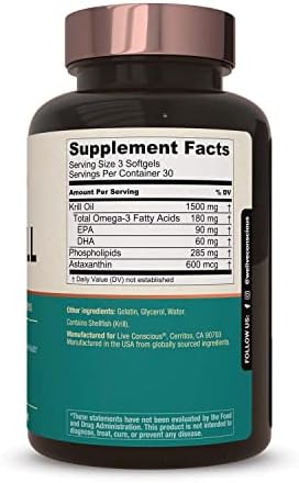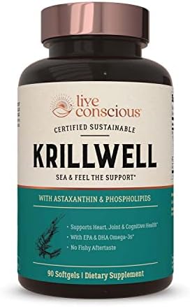 - HIGH QUALITY OMEGA 3 KRILL OIL SUPPLEMENT: In just 3 burpless, easy to swallow capsules, Live Conscious KrillWell delivers 1500 mg of pure krill oil along with 90 mg of EPA and 60 mg of DHA. With the addition of 600 mcg of Astaxanthin, a potent antioxidant, KrillWell is effective at combating common oxidative stress.*