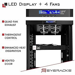 22U LOCKING SERVER RACK: Free standing 19 inch rack cabinet designed for IT, network, telecom and AV equipment installations. SECURE ENCLOSED DESIGN: Lockable front door and side panels help protect servers, switches, routers and networking hardware. COOLING & TEMPERATURE CONTROL: Built-in cooling fans with thermostat and LCD display support airflow and temperature monitoring. STANDARD 19” COMPATIBILITY: Adjustable mounting rails support ANSI/EIA-310 compliant rack mount servers and equipment. PROFESSIONAL SETUP INCLUDED: Includes 8-outlet PDU, shelf, locking casters (wheels), leveling feet, cable entry brushes and mounting hardware.