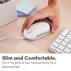 EFFICIENT & QUIET: If you are looking for a reliable and easy to use computer mouse that does not have unnecessary/complicated features and buttons, our wired mouse is the perfect solution. It is dependable, efficient, and reduces click noise by 90%. SLIM & COMFORTABLE: Whether you are right-handed or left-handed our corded mouse will be comfortable to use. It will require very little space due to its compact nature while being a nice visual upgrade to your work station. INSTANT DPI ADJUSTABILITY: Choose between 800 1200 1600 or 2400 DPI (Dots Per Inch) easily. Simply push the DPI button to set your desired sensitivity settings. UNIVERSALLY COMPATIBLE: Just plug & play no drivers needed! The perfect replacement Apple wired mouse or PC mouse. Works seamlessly across all platforms, and a cost-effective Apple mouse alternative or addition to your PC laptop or desktop. NO BATTERIES NEEDED | STABLE CONNECTION: The 5FT USB-A cable is the perfect length for a USB wired mouse and is long enough to accommodate almost all computer setups with no latency.