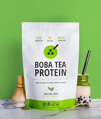 Boba Tea Protein Matcha Latte | 25g Grass-Fed Whey Protein Isolate Powder | Gluten-Free & Soy-Free Bubble Tea Protein Drink | Real Ingredients & Lactose-Free Protein Drink | 25 Servings
