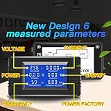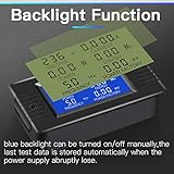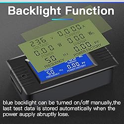 1. Digital Multimeter:This power energy meter can measure and display voltage current active power energy frequency and power factor at the same time.with split current transformer,more convenient to install . 2. Overload Alarm function:Backlight and power will flash simultaneously to give an alarm when exceeding the preset value.You can preset power limit by yourself. 3. Automatic Data Storage Function:The last test data is stored automatically when the power supply abruptly lose. Don't worry about data loss due to sudden power outages. 4. One-touch Control:The button can be used to control the backlight,reset energy, preset power alarm limit. 5. LCD Display:Large-screen LCD with all sight 180° view,The blue backlight can be turned on/off manually. PZEM-022 requires an external power supply to light up the screen.