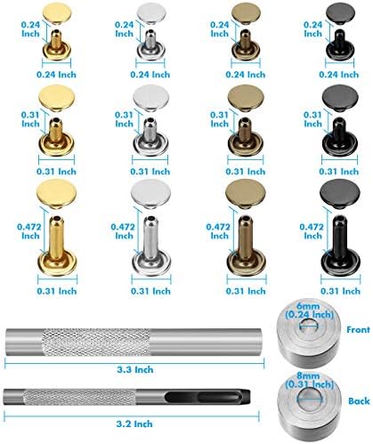 - bricolaje, varios tamaños y colores. Estos remaches de piel vienen en 3 tamaños: 6 x 6 mm, 8 x 8 mm, 8 x 12 mm y 4 colores: oro, plata, bronce y bronce. La superficie lisa y brillante es ideal para tus diferentes decoraciones de piel.