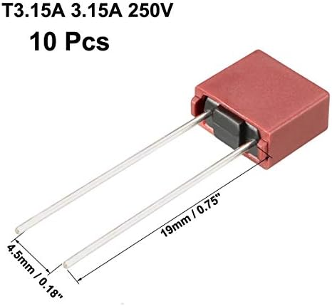 Specification:Fuse Type: Slow Acting Blow (Time Delay Burn)Material: Electronic Parts, MetalRating: 250V, T3.15AColor: BlackBody Size: 8.3mm x7.8 mm x 4/ 0.33-inch x 0.31-inch x 0.16-inch(Lx W x H)Pin Length: 19mm / 0.75-inchPin Distance: 4.5mm / 0.18-inchPackage Content:10 Pcs x Micro Fuses