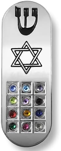 Protection CAR MEZUZAH with Travelers Prayer Scroll Hoshen Mezuza From Jerusalem Art Judaica Gift *This beautiful silver color nickel Mezuzah made in Israel by AMY Gifts. *Decorative Judaica design featuring the 12 Tribes Of Israel - Hoshen Stones, Jewish Star Of David and Hebrew letter Shin (Shomer Dlatot Israel - Keeper of the doors of Israel) *The main function of the MEZUZAH is to PROTECT from evil *Great handcrafted gift from the Holy Land *Size of mezuzah case: 5 cm x 2 cm / 2" x 0.8". Comes with gift box Comes with double-sided adhesive tape and ready to mount.
