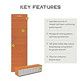 Highly-efficient, hexagonal nesting pattern allocates more space for taller, wider nodes, providing significantly greater plushness. More precise tooling eliminates wasted space between folded layers, enabling taller nodes to nest tighter for a smaller packed size. Taller nodes create more space for uncompressed sleeping bag insulation, trapping more warmth around your body. Premium dual-density Axiotomic foam offers a supple layer for comfort and a resilient layer for support. Metallized thermal reflective film reflects heat back to your body and is protected by a durable film.