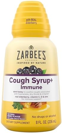 - ZARBEE'S COUGH SYRUP WITH REAL ELDERBERRY: With dark honey to soothe coughs associated with hoarseness, dry throats and irritants.* Includes real elderberry, Vitamin C, D and Zinc to support the immune system.* With beehive cap for easy dosing.