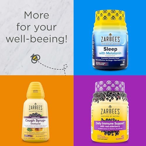 Zarbee's Adult Daytime Complete Cough Syrup + Immune is a simple, safe, and effective cough syrup that is made from a proprietary blend of dark honey to help soothe coughs associated with hoarseness, dry throat and irritants.* This syrup contains zinc, vitamins C & D, minerals & elderberry for immune support to help you feel your best.* Our Cough Syrup + Immune is made from carefully selected ingredients inspired by nature - free of drugs, alcohol, artificial sweeteners, artificial flavors, and gluten. Our great-tasting, natural berry flavor syrup is safe & effective for adults and kids 12 years+. Check out our complete range of products that are made from carefully selected ingredients inspired by nature and backed by science. *These statements have not been evaluated by the Food and Drug Administration. This product is not intended to diagnose, treat, cure, or prevent any disease.