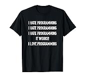 - Programming Love-Hate Relationship design. This funny coding tee shirt captures how all software engineers feel when debugging. I hate programming until it works and then I love programming. Makes a great birthday gift or Christmas present for friends and family, especially if they are programmers, geeks, and nerds who love coding.