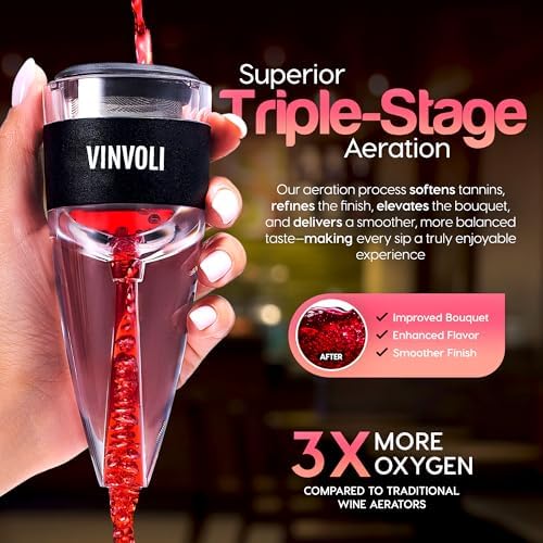 - Ultimate 3-in-1 Wine Aerator: Enjoy a luxurious experience with this unique 3-in-1 Vinvoli Wine Aerator Decanter with a convenient pourer and wine sediment filter. Refine your wine flavor in seconds.