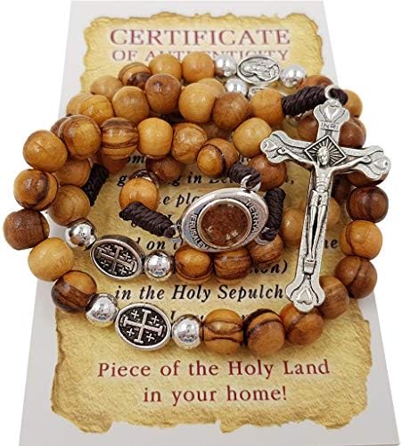 Rosario católico de cordón de cuentas de madera de olivo con tierra santa de Jerusalén y certificado en estuche de terciopelo azul. Este rosario artesanal es de excelente calidad con cuentas redondas de madera de olivo real de 5 mm, crucifijo católico de tono plateado con la palabra "Jerusalén" grabada convexamente en el reverso, pieza central (un lado - icono de la Virgen María, otro lado - Tierra Santa de Jerusalén con las palabras "Terra Jerusalem") y medallas con la Virgen María. El crucifijo y los conectores están hechos de zinc y recubiertos de plata, evitando la corrosión. Este rosario está hecho a mano en Belén, Tierra Santa, por artesanos cristianos locales y bendecido en la Iglesia del Santo Sepulcro, Jerusalén. Viene con un estuche de terciopelo para rosario gratis. POR FAVOR TENGA EN CUENTA: El color y las texturas de las cuentas pueden ser ligeramente diferentes, pertenecen a la edad del olivo. *Mide aproximadamente 40 cm / 16 pulgadas.