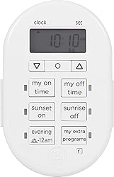 Simple to setup indoor timer with programmable my on/off buttons and customizable weekly settings. Choose from preset options or set up to 8 custom on/off times. Built-in SunSmart technology allows you to set on/off times that automatically adjust to sunrise/sunset times in your region. Features two heavy duty grounded outlet. Ideal for use with indoor lighting, seasonal lighting, electronics, lamps, fans, and other small appliances, electronics. Compatible with LED, CFL, Incandescent and Halogen bulbs, also works with dimmable LED and CFL bulbs Saves settings so that you don’t have to reprogram the timer in the event of a power outage or if unplugged. Also features blue LED indicators that show active programs and a large LCD screen for effortless viewing. Total ratings for outlet: 125V, 50/60Hz, 15A, 1875W General Purpose/Resistive, 10A, 1250W Tungsten, 1/2HP