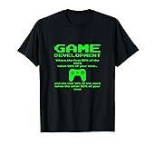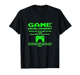 - GAME DEVELOPMENT Where the first 90% of the work takes 90% of your time... and the last 10% of the work takes the other 90% of your time. The graphic design features vintage style, retro, old school, pixelated green text and a video game controller. Fun present for a new video game developer, video game designer, video game programmer, video game creator or a software developer who specializes in video game development and loves funny game development jokes or game development humor