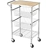 Amazon Basics 3-Tier Metal Basket Rolling Cart with Wood Top, Silver