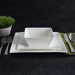 SIMPLE ELEGANCE: Set features an embossed basketweave design on a coupe shaped square body on bone china CHIP RESISTANT: made from high quality Bone Ash for superior strength and durability for everyday use BEAUTIFULLY CRAFTED: translucent, lightweight and crisp white color, made of high-quality bone china MEASURES: 16-piece dinnerware set includes 4 each of: 10.5-inch dinner plate, 8-inch salad plate, 6-inch cereal bowl with a height of 2-3/4 inches and 14-ounce square mug with a height of 4-1/2 inches and a diameter of 3-1/2 inches EASY CARE AND REHEATING: Dishwasher and microwave safe