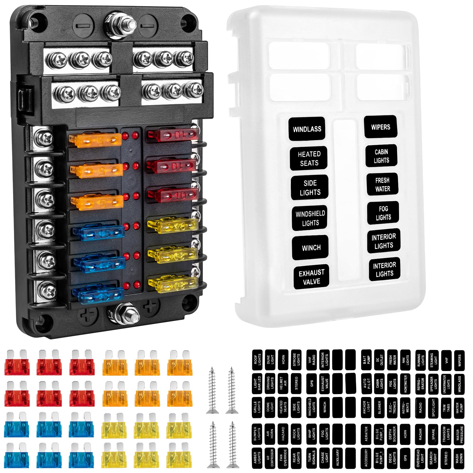 - PACKAGE INCLUDE: 1 pcs 4 way fuse box holder;12 pcs blade fuses: 5 A x 2, 10 A x 2, 15 A x 2, 20 A x 2, 30 Ax 2, 40 Ax 2. Note: This box holder is suitable for standard blade fuses(ATO/ATC).Please check the size or shape of fuse before purchasing