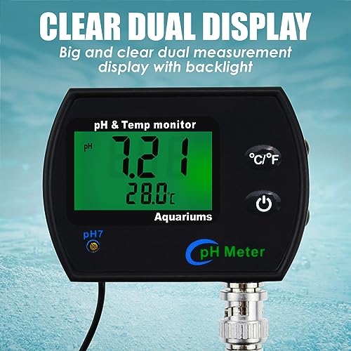 - CLEAR DUAL DISPLAY:The Ph Meter & Aquarium Thermometer have Big and clear dual measurement display with backlight, Power supplied by batteries or 6V DC (Both are included), ideal for long-term continuous monitoring