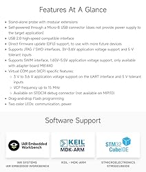 - Key Features Stand-alone probe with modular extensions Self-powered through a Micro-B USB connector (does not provide power supply to the target application) USB 2.0 high-speed compatible interface Direct firmware update (DFU) support to use with more future devices JTAG / serial wire debugging (SWD) specific features: *3 V to 3.6 V application voltage support and 5 V tolerant inputs *Flat cables STDC14 to MIPI10 / STDC14 / MIPI20 (connectors with 1.27 mm pitch) *Flat cable for 20-pin JTAG/SWD (2.54 mm pitch) (extra free cable from Waveshare) *SWD and serial wire viewer (SWV) communication support SWIM specific features (only available with adapter board MB1440): *1.65 V to 5.5 V application voltage support *SWIM header (2.54 mm pitch) *SWIM cables with dual 4-pin connectors / 4-pin connector to separated pins (2.54 mm pitch) (extra free cables from Waveshare) *SWIM low-speed and high-speed modes support Virtual COM port (VCP) specific features: *3 V to 3.6 V application voltage support on the UART interface and 5 V tolerant inputs *VCP frequency up to 15 MHz *Available on STDC14 debug connector (not available on MIPI10) Multi-path bridge USB to SPI/UART/I2C/CAN/GPIOs specific features: *3 V to 3.6 V application voltage support and 5 V tolerant inputs *Signals available on adapter board only (MB1440) *Drag-and-drop Flash programming *Two color LEDs: communication power Supported Software STM32CubeProgrammer/ KEIL RVMDK/ IAR EWARM/ GCC-based IDEs Supported Devices All STM8 MCUs with SWIM interface/All STM32 MCUs with JTAG / SWD interface