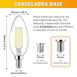- Product Specifications Not Dimmable Base Type:E12 Color: 5000K Daylight White Luminous Intensity: 550lm Watts: 4W CRI:≥80 View Angle: 270 degree Input Voltage: 120V AC Incandescent lamp Equivalent: 60-watt Diameter: 35mm, Height:99mm Lifespan: 20000 Hours Package 5 E12 4W LED Classic Candelabra Bulbs Daylight White 5000K
