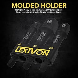 - Here’s How You Can Easily Turn Any Power Drill Into A High Torque Impact Wrench!Looking for a set of heavy-duty, solid steel impact socket adapters?Need a set of multi-use, well-made and durable socket extensions for your auto repair projects?Want to save time, effort and money?Introducing LEXIVON Impact Grade Socket Adapter Set With the 3" Extension Bit & Holder!No longer settling for those cheaply-made, wobbly, complicated nut driver bits,since we have created a set of robust drill to socket adapters helping you to adapt your power drill into a high-torque impact driver with zero effort. Why Choose LEXIVON Drill to Drive Adapter Set?Superior-Quality – Heat Treated Chrome Vanadium Alloy Steel ensuring your power tool accessories will endure high torque applications without skipping a beat.Multiple Applications – Use your impact driver set with its 3" extension bit for household maintenance tasks, DIY projects, automobile repairs and all home improvement projects.Secure & Tight Fit – Spring-pressured ball locking mechanism helps fit your drive sockets on the adapters easily and securely, Knowing they will stay in place even during the toughest tasks.Universal Compatibility – The ¼” Hex Shank fits all quick-change systems and standard drill chucks while the 3 square drive sizes (1/4”, 3/8”, 1/2”) ensure maximum versatility.Rust-Resistant Design – Treated with a Black Phosphate coating, the LEXIVON impact drill driver set is both rust-proof and corrosion-resistant for unparalleled durability. And That’s Not All! We offer you a handy holder that keeps your socket extension adapter set neatly organized in your toolbox.Click “Add To Cart” NOW & Get Your Drill Driver Set With A LIFETIME limited Warranty!