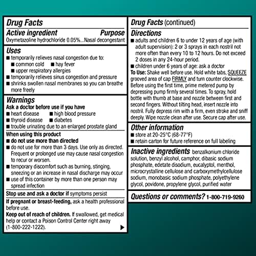- ACTIVE INGREDIENT: This nasal spray contains oxymetazoline HCl, a nasal decongestant and the doctor recommended adult nasal spray active ingredient (source: IQVIA physicians survey 2019), which compares to the active ingredient in Afrin No Drip. Offers maximum strength nasal congestion relief.