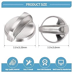 PACKAGE INCLUDES: 5 x WB03T10284 OVEN & RANGE BURNER KNOBS ✅[IDEAL GE STOVE KNOBS REPLACEMENT]: Want new ge stove knobs that matches the original? This WB03T10284 ge appliance knob was specifically designed to look and function the same as the original GE range knobs on your cooktop. While this GE electric stove knobs is NOT a original part, it is a direct replacement and it will appear, fit and work like the factory part. ✅[IDEAL GE STOVE KNOBS REPLACEMENT]: Want new ge stove knobs that matches the original? This WB03T10284 ge appliance knob was specifically designed to look and function the same as the original GE range knobs on your cooktop. While this GE electric stove knobs is NOT a original part, it is a direct replacement and it will appear, fit and work like the factory part. ✅[FIT THE FOLLOWING MODEL]: 191d5100 ge knob works with all models listed in product description. For example, compatible with GE ECBP82SM1SS ECBP82SM2SS EER4001N01SS EER4001N02SS JB3001R1SS JB3001R2SS JB3001R3SS JB645ST1SS JB645ST2SS JB645ST3SS JB650ED1ES JB650ST1SS JB650ST2SS JB650ST3SS JB655ST1SS JB655ST2SS JB655ST3SS JB680SP1SS JB680SP2SS JB680SP3SS JB680SP4SS JB680SP5SS JB680ST1SS JB680ST2SS JB680ST3SS JB680ST4SS JB700SN1SS JB700SN2SS JB700SN3SS JB700SN4SS JB700SN5SS Electric Range. ✅[REPLACES PART NUMBER]: The GE replacement range burner control knobs only fit for WB03T10284 1373043 AP4346312 AH2321076 EAP2321076 PS2321076, this GE electric range knobs is a direct replacement for the cooktop on your kitchen.The WB03T10284 range burner control knobs insert diameter is 0.236 inch/ 0.6 cm, the handle length is 2.2 inch/ 5.6 cm, and the knob diameter is 2.1 inch/ 5.33 cm, please make sure the size is suitable for your stove before purchasing. ✅[BUY WITH CONFIDENCE]: 90 days return or exchange policy and free replacement if needed, true worry-free shopping experience. If the ge knobs replacement ever fails on your cooktop/range/ stove/oven, simply contact us for a replacement. ✨Note: Ge knobs are made of durable plastic and color is stainless steel. The material is not stainless steel virtually, but is reliable and sturdy for long-term use.