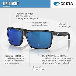 LENS MATERIAL: Costa's most high tech lens - 580 Glass provides superior clarity, ultra scratch-resistant, 100% UV protection and the best polarizing efficiency available. LENS COLOR: Blue Mirrored Polarized is best for bright, full-sun situations on the open water and offshore. FRAME FEATURES: Rinconcito feature a rectangular, matte grey frame and blue mirrored polarized 580G mineral lenses. PROTECTIVE CASE AND CLEANING CLOTH: Costa case and cleaning cloth included to keep your Costa's safe while you are getting after it. VISIT THE COSTA DEL MAR BRAND SHOP: Click on the Costa Del Mar link above the product title to shop the entire Costa Del Mar sunglass and eyeglass assortment.