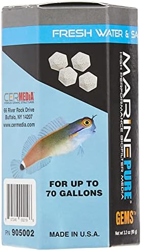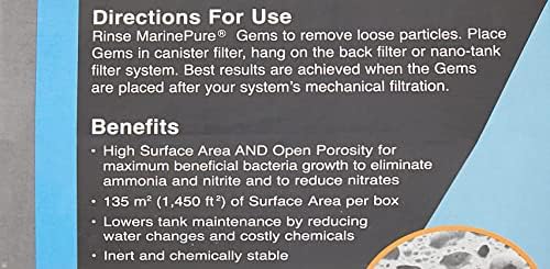 MarinePure Gems Are Approximately ¾ Inches In Diameter. Each Box Contains Over 1,450 Square Feet (135 Square Meters) Of Accessible Surface Area. Marinepure Gems Are The Perfect Size For Canister Filters, Hang On The Back Filters Or Nano-Tank Filter Systems. This Amount Of Media Is Good For Up To 70 Gallon Systems. They Are The Perfect Solution For Ammonia And Nitrite Elimination And Most Users Will Also See Better Control In Their Nitrates.