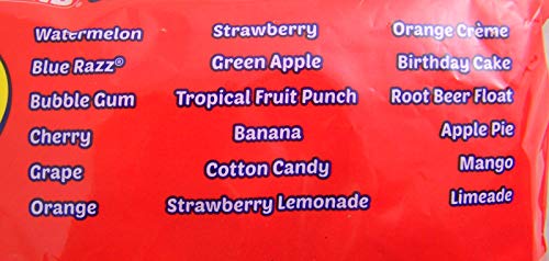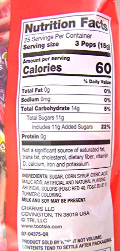 18 Flavors - Watermelon, Blue Razz, Bubble Gum, Cherry, Grape, Orange, Strawberry, Green Apple, Tropical Fruit Punch, Banana, Cotton Candy, Strawberry Lemonade, Orange Creme, Birthday Cake, Root Beer Float, Apple Pie, Mango, Limeade. Artificially and naturally flavored. 20 calories per pop. Peanut free. Gluten free. Produced in a facility that does not use peanuts, tree nuts or gluten. Shop & compare - 75 pops! Product sold by weight not volume. Contents tend to settle after packaging. Flavor assortment may vary. www.tootsie.com. Scan or call for more food information 1-800-877-7655.