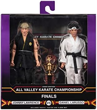 De Karate Kid, la icónica película de los 80 que hizo que una generación de niños se apresurara a inscribirse en clases de karate. Estas figuras de acción vestidas muestran a Daniel y Johnny con sus uniformes de karate, listos para competir en los campeonatos de karate de todo el valle. El paquete de 2 incluye un accesorio de trofeo, póster de réplica y alfombrilla para el suelo. Cada figura totalmente articulada mide aproximadamente 8 pulgadas de alto y presenta una imagen autorizada. Embalaje de caja con ventana.