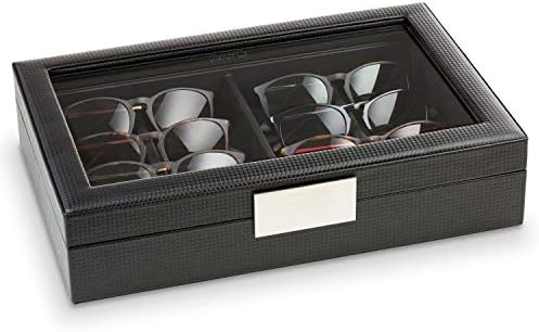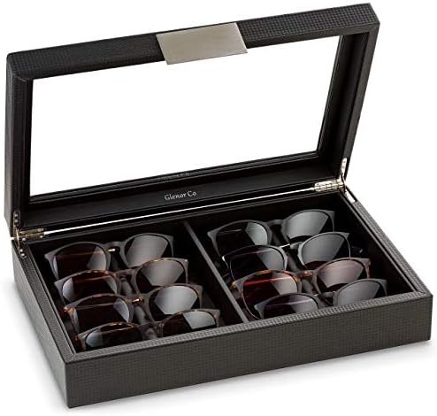 Glenor Co Sunglasses Organizer Case - Storage Holder to Display 8 Sunglass or Eye Glasses - Modern Box with Clear Glass Top and Metal Buckle for Men and Women - Carbon Fiber Leather Design - Black HOLDS 8-10 SUNGLASSES -The unique dividers in this Glenor Co sunglass organizer will house 10 smaller glasses or 8 larger ones. Its open space will even house oversized or oddly shaped glasses and will make it easy to select the pair of glasses you choose every morning. SUPERIOR QUALITY - This Glenor Co sunglass case is made with 2 strong , smooth hinges that will stay up when opened and thick sturdy walls , real glass lid and the best craftsmanship out there. Unlike others with cheap ribbons or a poor quality hinge that break easily and peeling seams that come apart, these boxes were built to last for decades. UNIQUE,CONVENIENT & MODERN DESIGN - This Sun glass Box boasts a unique ,convenient and clean minimalistic look that will take up little space on your dresser while greatly enhancing any space. The modern metal accent handle allows for the box being easily opened and closed with one hand only. ALL IN ONE PLACE - Keep all of your sunglasses neatly displayed in this storage box keeping them safe from dust, falls, scratches and getting lost. Never lose a pair of eyeglasses again. DIMENSIONS : 14" x 9" x 3" . Holds Eyeglasses up to 160mm wide. MAKE AN AMAZING GIFT - This Glenor Co sunglasses holder is so Elegant and Luxurious you will feel so proud to be giving this as a gift at any occasion . For men and women. It is a definite pleaser . It is also already packaged in an elegant gift box and includes a blank card , all ready for gifting . You'll be one proud gifter! 100% satisfaction Guaranteed by manufacturer.