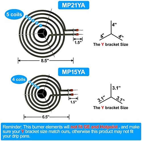 - 【Reminder】This stove burner replacement set will not fit GE and Hotpoint. When buying that please make sure your “Y” Size can match ours, otherwise this product may not fit your drip pans. And the new stove burner has a layer of protect coating on it, which is used to protect the surface. When using the item for the first time, the protect coating will volatilize with the high temperature, it maybe has a little smog, which is normal because it is caused by the protective layer of the new burner element. Customer continue to use the product for about 20 minutes, and there will be no more smoke when next time use. MP15YA specs include 6" 4 coils, MP21YA include 8" 5 coils.