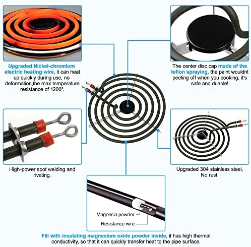 - 【High Quality Stove Burner】This Electric Range Burner Element Unit heats up quickly during use, which could seve energy. It is made of high quality material with large resistivity, small temperature coefficient of resistance, low deformation at high temperature and is not easy to embrittle, which is steady and durable to use. Tested by manufacturer to match and/or exceed specifications of OEM products.