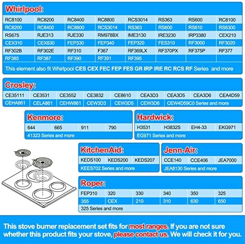 - 【Compatibility】This stove burner replacement set fits for most ranges. Reminder: It does not fit for GE and Hotpoint. If you select the wrong burner set, it will not fit your stove. If you are not sure whether the product is compatible with your stove, please feel free to contact us, we will help you confirm it. Replace part number: 484782, 9761347, 12001231, S46Y15, 5304431014, 484783, SU204, 04000034, 0045546, 0051088, 0054794, 0067069, 0071930, 3374, AP3075808, PS340571, EAP340571.