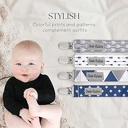 - The Dodo Babies Pacifier Clip & Teether Toy Set is crafted to bring both style and convenience to your parenting experience. This 6-piece set is designed to keep pacifiers and teething toys clean and secure, making it ideal for outings and home use alike. As the cooler months arrive, this set ensures that pacifiers remain within reach and teething toys are always handy for soothing little ones. Suitable for both baby boys and girls, the set includes four fabric pacifier clips with a universal holder loop that fits most brands. These pacifier clips attach securely to clothing without causing damage, making them useful for use on the go. The metal clips provide durability and reliable fastening, ensuring your infant teethers and pacifier clips stay in place as your child explores their environment. The set also features two silicone teether toys, crafted from baby-safe silicone, providing gentle relief for tender gums. These silicone teething toys are easy for tiny hands to grip, making them excellent infant toys for both baby boys and girls. The soothing design of these teething products helps calm and comfort your baby, making them a practical choice for new parents. All components of the set are machine washable, ensuring easy maintenance and longevity. The gender-neutral colors of blue and gray make this set a versatile addition to any nursery or diaper bag. A pacifier holder case is included, keeping your pacifier clips and teether toys organized with ease. For families seeking reliable baby items, the Dodo Babies Pacifier Clip & Teether Toy Set is a thoughtful choice for new parents. With its universal compatibility, this set supports parents throughout the early stages of parenthood, balancing function and style. Whether at home or on a stroll, ensure your baby's pacifiers and teething toys are always secure and accessible.