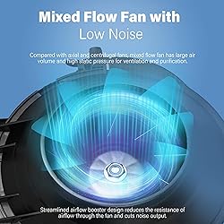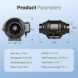 Upgraded Fan: Size: 4inch; fan speed: 2500 RPM; air flow: 130 CFM; bearings: double ball. 110V standard household plug; Pre-wired 5.9 feet power cord. Max Ambient Temp is 140℉/ 60℃ Speed controller: Three speed switches enable fan to run at low, medium and high speed. Durable 3-pole grounded plug need no extra wires to deal with. You can correctly and precisely adjust the airflow level according to your requirement Easy installation: Feature with lightweight and compact enough to be installed in any angel and little availvable areas. Simply remove the duct ends with locking tabs for quick installation and easy maintanance Mixed flow design: Compared with axial and centrifugal fans, mixed flow fan has large air volume and high static pressure for ventilation and purification. Durable plastic housing and blades revolve smoothly and powerfully and cut noise output to 35 dB Safe and versatile applications : Fully enclosed junction box, waterproof and dustproof design ensures safe usage and long service life in industrial, household and horticulture ventilation applications. Such as bathroom, washroom, office, grow tent