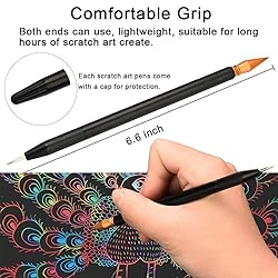 【Scratch Off Tool】 You will get 10 x Scratch Art Pens, 1 x Red Scraper, ,1 x Black Brush, 1 x Bamboo Stick, 1 x Storage Bag, these scratch tools with different functions which can satisfy your multiple needs. 【Scratch Coloring Pen】 Each scratch art pens come with a cap for protection, curved and smooth shape suitable for comfortably gripping. 【Wonderful Scratch Art Tools】The scratch tools set allow you to quickly and conveniently draw beautiful patterns on scratching papers or scratch board, convenient to DIY art painting. 【Easy To Use】Scratch pen and bamboo stick are applied to scratch the black surface of the cardboards and reveal rainbow colors; Scraper is applied to makes thin detail strokes on scratchboard; Brush is applied to clean the surface. 【Great Scratch Tools for Art】Perfect scratch tool kit for kids and adults who like to draw, and create scratch art. Also great gift as birthday, holiday, education, Christmas gifts.