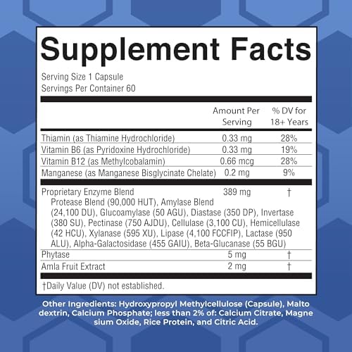 - Vegan Formula: We include more of every enzyme that can help you feel your best: Protease, Amylase, Glucoamylase, Diastase, Invertase, Pectinase, Cellulase, Hemicellulase, Xylanase, Lipase, Lactase, Alpha-Galactosidase, and Beta-Glucanase. Our enzymes also include Vitamin B1, B6, B12, Calcium, Magnesium, Manganese, Amla, and Phytase. Other Ingredients: Hypromellose, Maltodextrin, Calcium Phosphate.